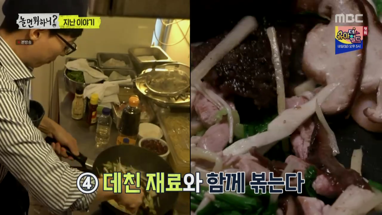 김태호의 꼬임?에 넘어가서.. 또 라면 장사를 하게 된 유재석.. ㅎㅎ 여기서 유산슬 라면 레시피를 배우게 됩니다.